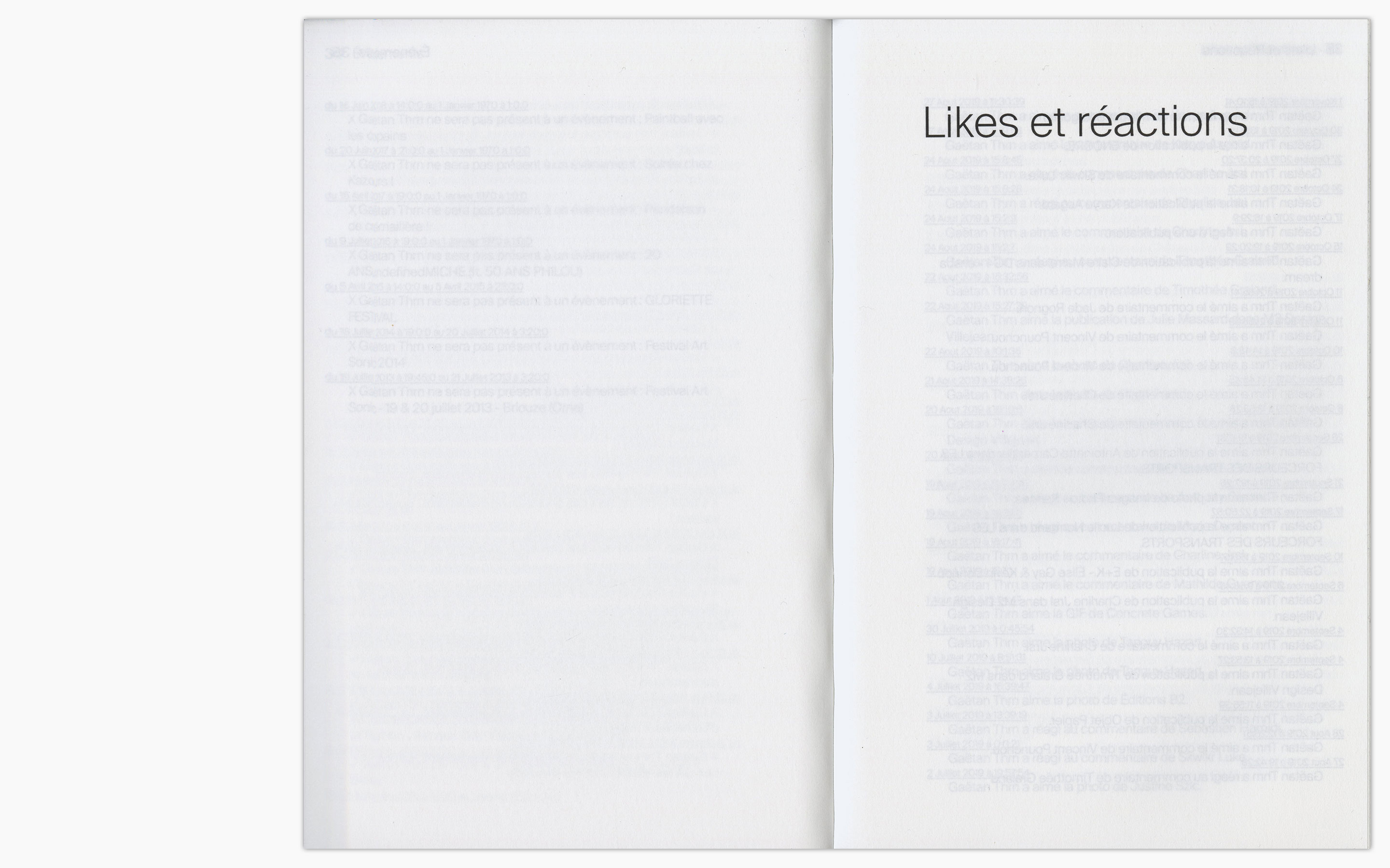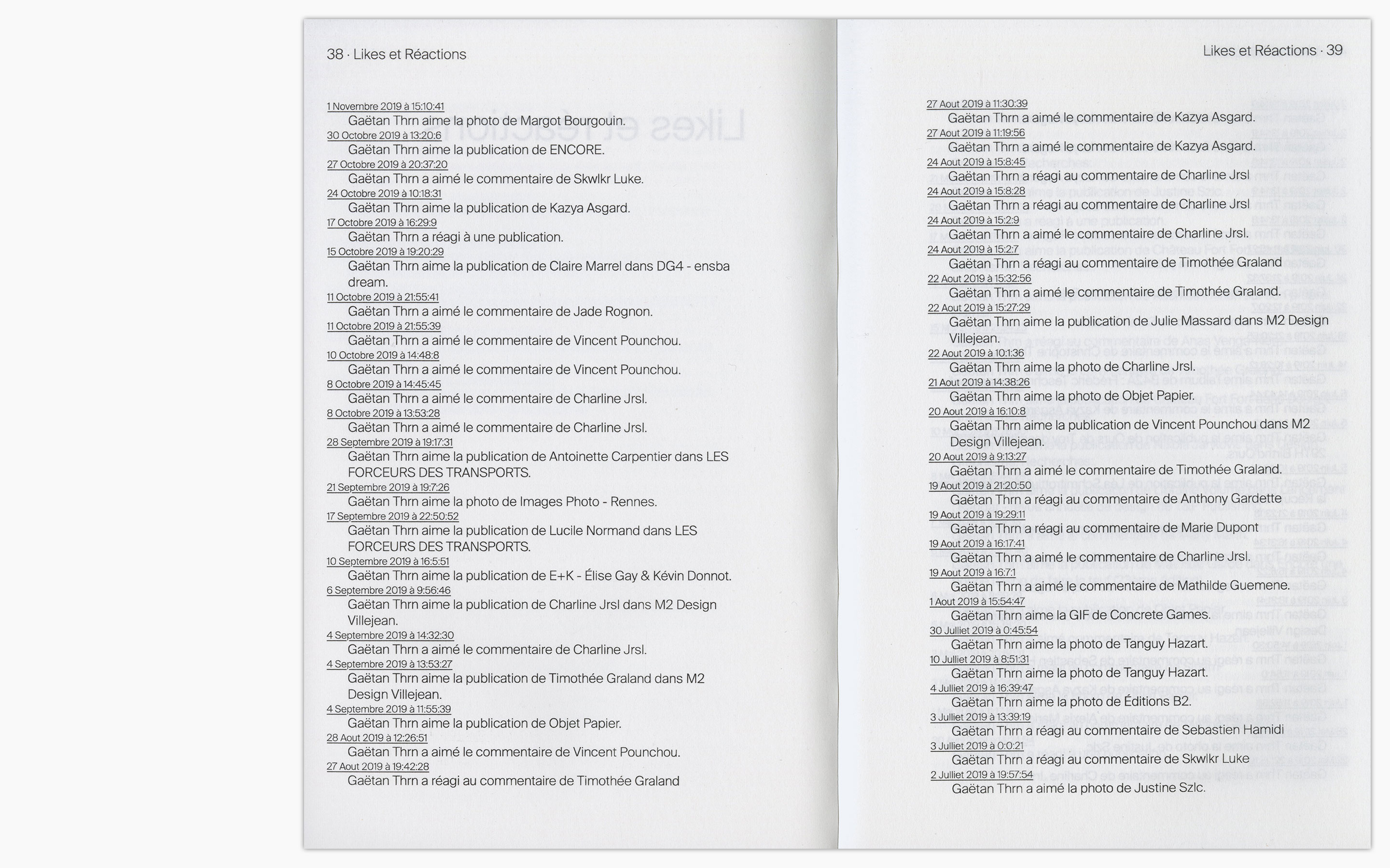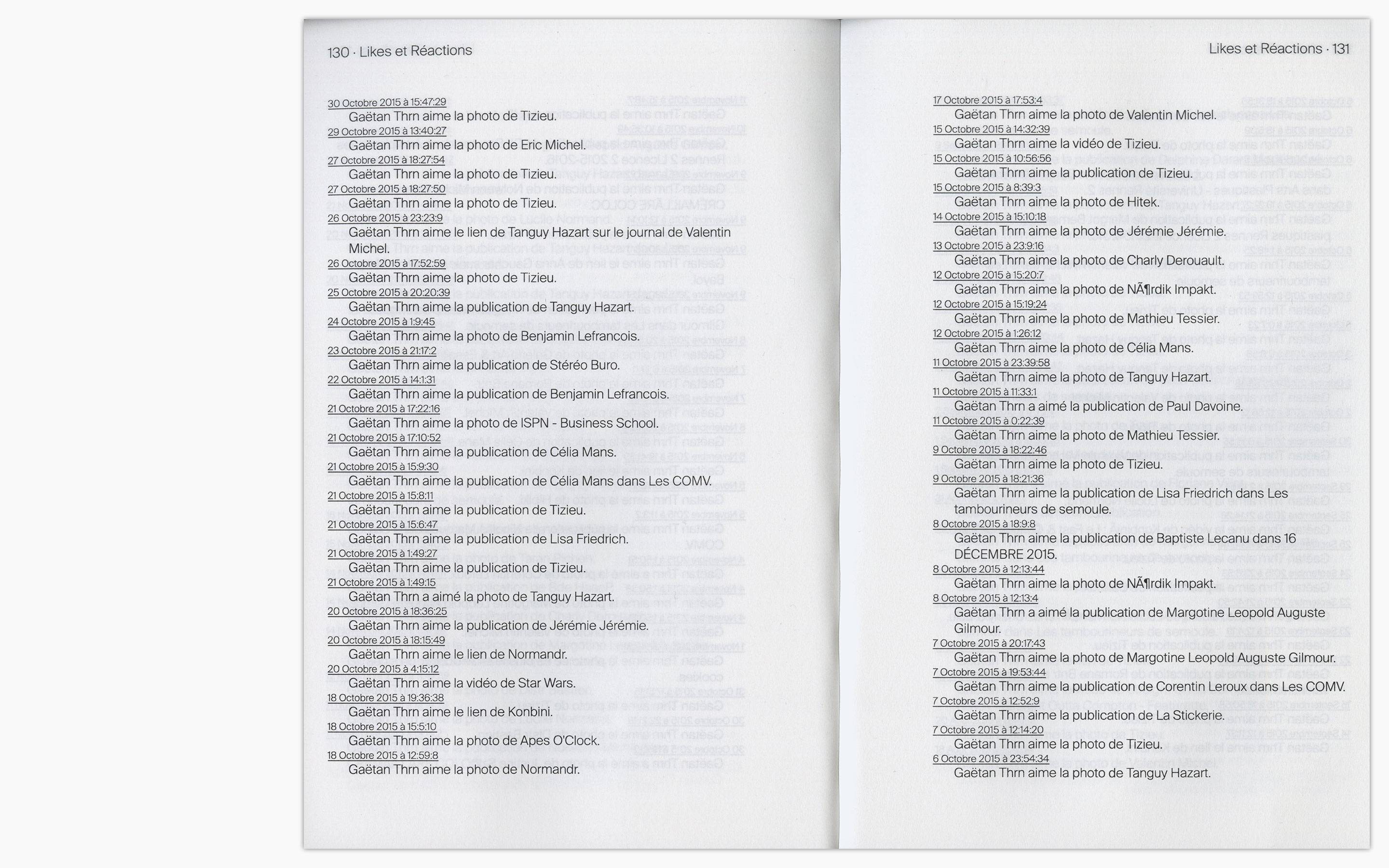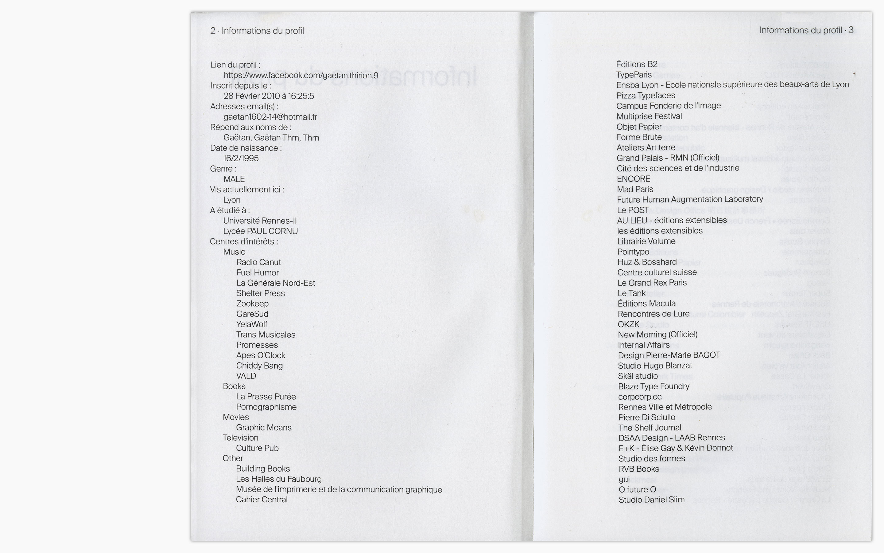 Réalisée à partir des informations archivées par Facebook depuis mon inscription le 28 février 2010, cette série d'éditions en plusieurs volumes est le résultat d'une semaine de Workshop. Le tri des données et la mise en page a entièrement été conçue grâce au langage informatique. Une fois tous les ouvrages imprimés, cette série classe, répertorie et rend quantifiables les informations personnelles qui transitent sur les réseaux sociaux.