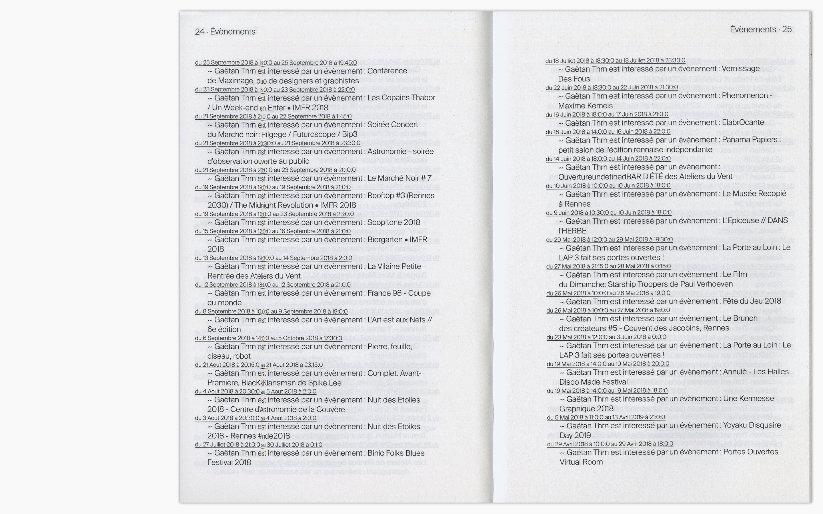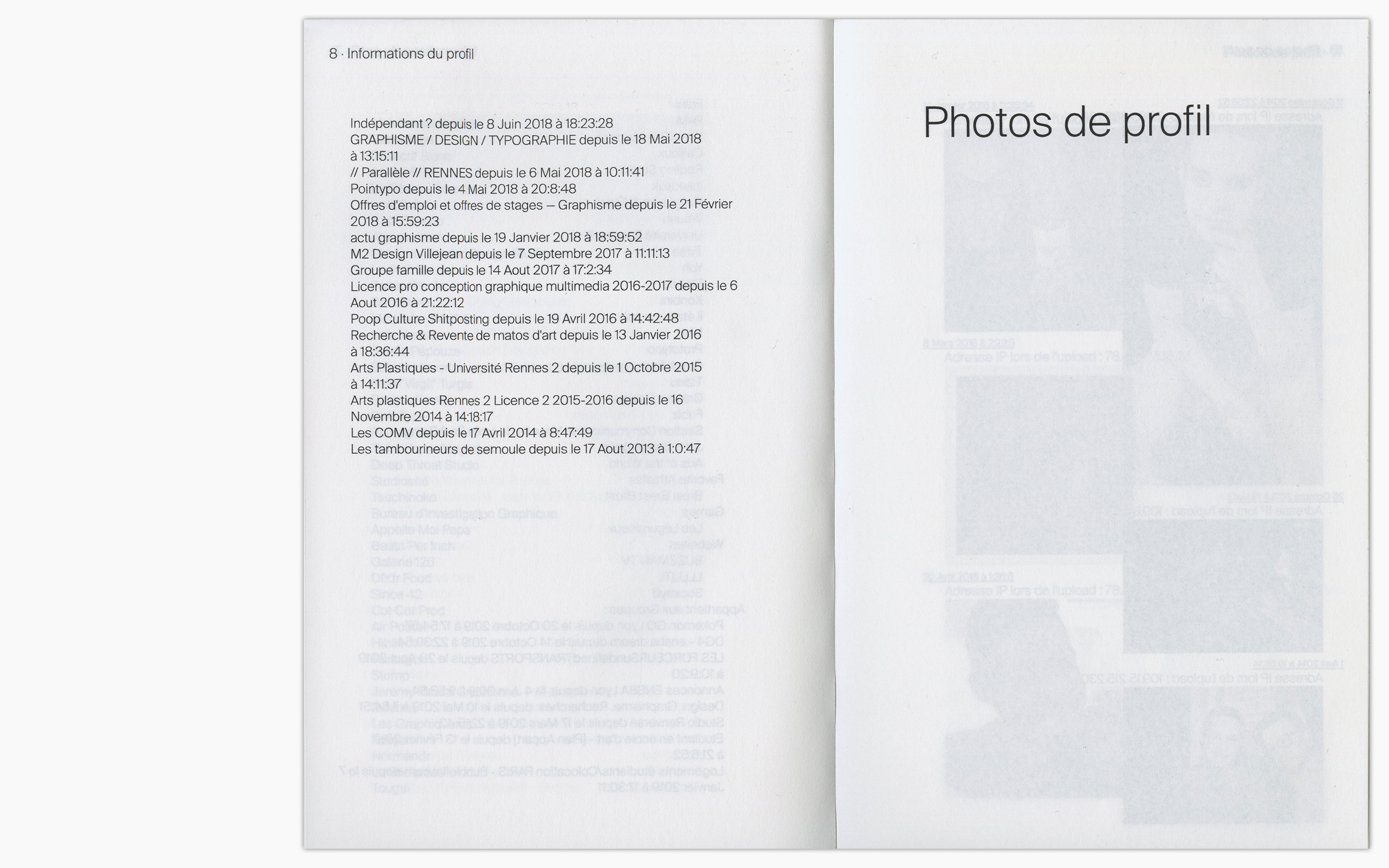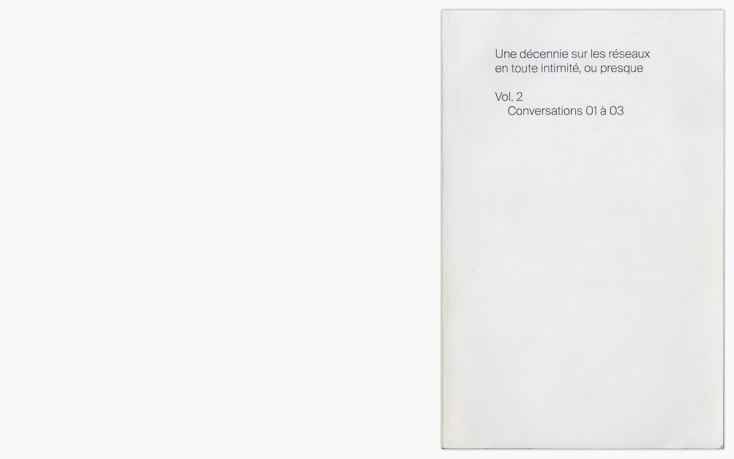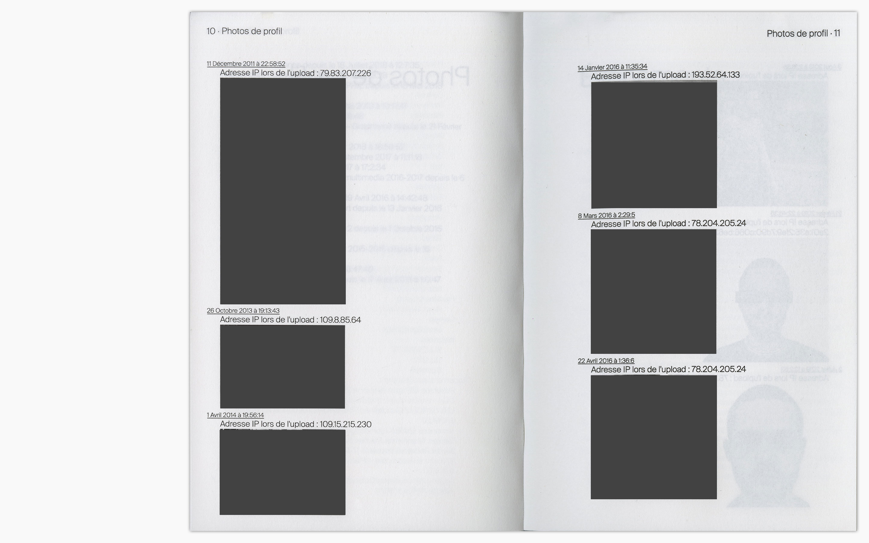 Réalisée à partir des informations archivées par Facebook depuis mon inscription le 28 février 2010, cette série d'éditions en plusieurs volumes est le résultat d'une semaine de Workshop. Le tri des données et la mise en page a entièrement été conçue grâce au langage informatique. Une fois tous les ouvrages imprimés, cette série classe, répertorie et rend quantifiables les informations personnelles qui transitent sur les réseaux sociaux.